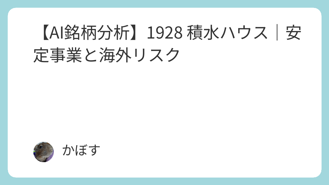 積水ハウスは、事業の安定性と株価の割安性から、ポートフォリオにおけるディフェンシブコアとして組み入れを検討する価値があります。しかし、主要な成長ドライバーである海外事業には不確実性が伴い、現時点では明確なカタリスト(株価を大きく押し上げる要因)に欠けています。このため、ポートフォリオの分散目的として、ごく一部の余力での組み入れを検討する程度に留めるのが妥当であると考えられます。