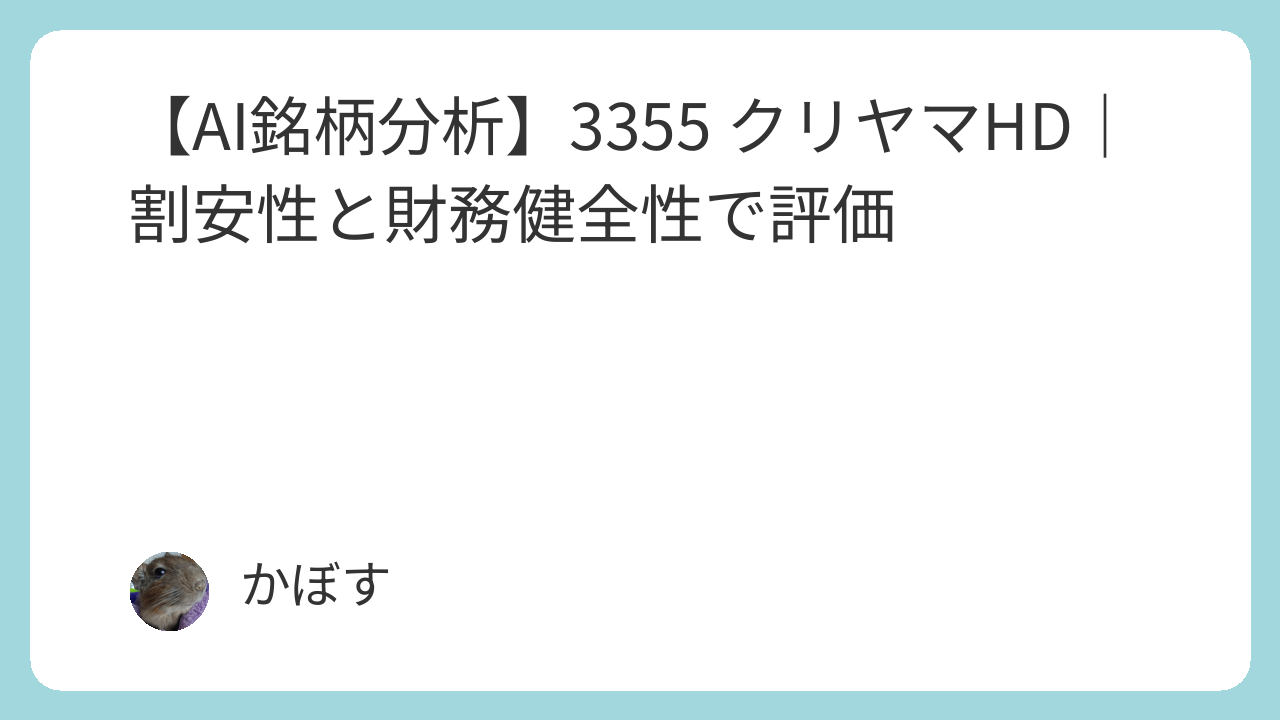 本レポートでは、クリヤマホールディングス(3355)の事業、財務、株価指標、そして今後の成長性について、AIが多角的に分析した結果をまとめました。投資判断の一助としてご活用ください。