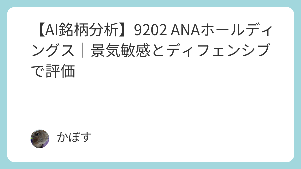 この記事は、ANAホールディングス(9202)について、収益性、成長性、財務健全性、割安性などの多角的な観点からAIが分析し、その結果を構造化したレポートです。本銘柄が、個人の資産形成における「ディフェンシブコア」や「キャピタルゲイン狙い」といった投資スタイルに合致するかを評価しています。