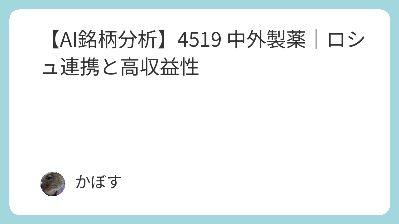 中外製薬は、安定した事業基盤と高水準の配当利回り(予想3.61%)を持つディフェンシブコアの要件を満たしつつ、ロシュ連携という極めて確度の高い成長ドライバーを併せ持っています。