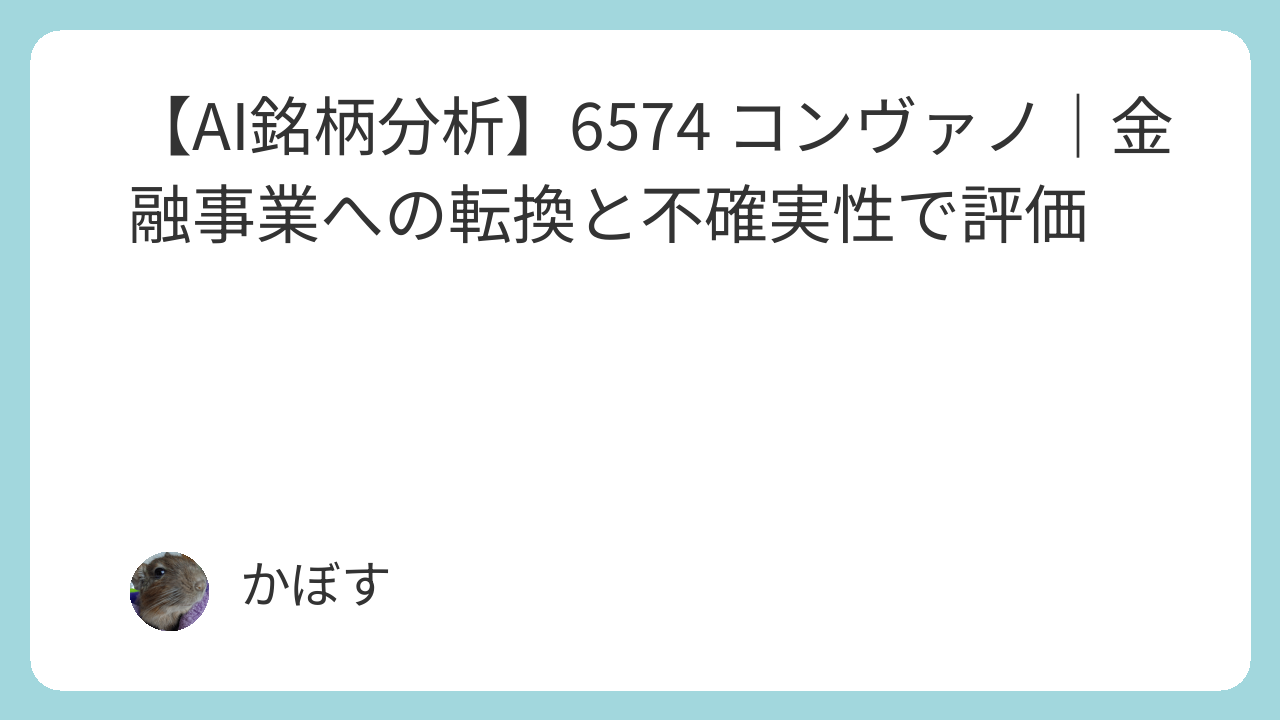 本レポートでは、超高成長を計画し、事業構造を急激に転換しているコンヴァノ(6574)について、その収益性、成長性、リスクなどを客観的に評価します。特に、キャピタルゲイン狙いの投資スタイルとの整合性に着目し、その高いリターンポテンシャルと、事業転換に伴う不確実性のバランスについて分析しました。