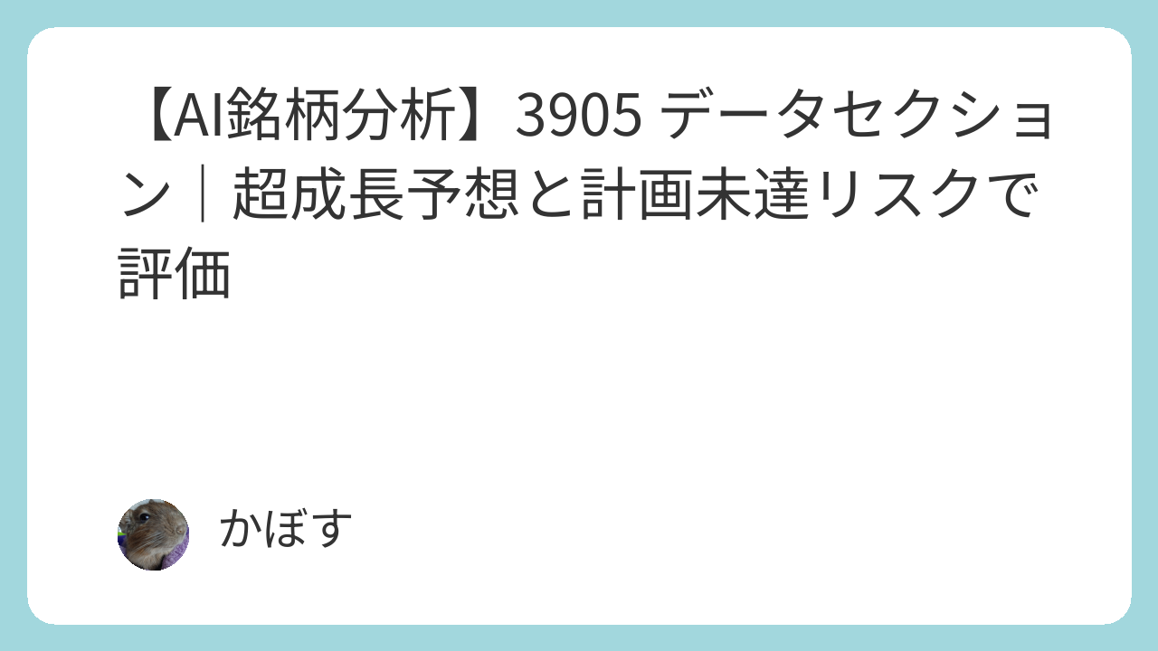 本レポートでは、データセクション(3905)の財務、成長性、リスク要因、および事業転換の可能性を分析し、中長期的な投資判断をサポートするためのAI評価を提供します。本銘柄は、驚異的な成長計画と過去の継続的な赤字という、両極端な特性を持つ点に注目が必要です。
