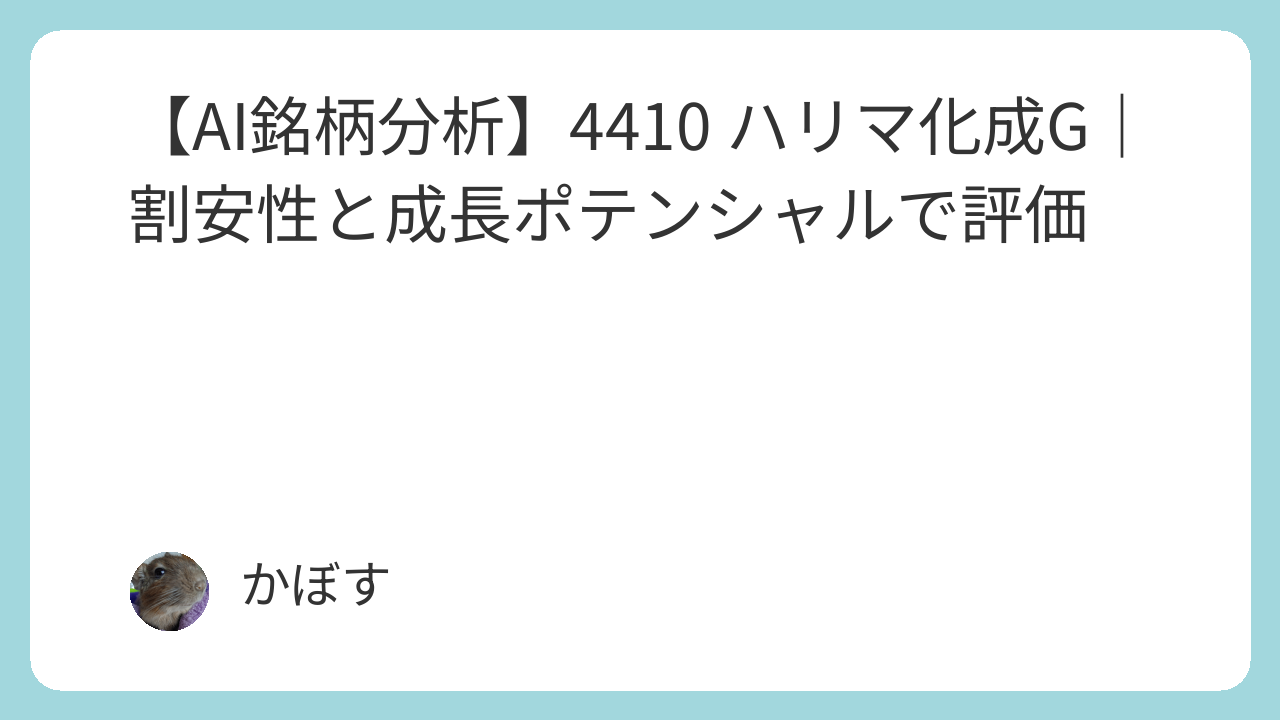 本レポートは、化学素材メーカーであるハリマ化成グループ(4410)について、AIによる客観的な定量・定性分析の結果を構造化し、投資判断の参考情報として提供するものです。特に、同社の割安性、低収益体質、そして今後の成長ポテンシャルについて詳細に評価しています。