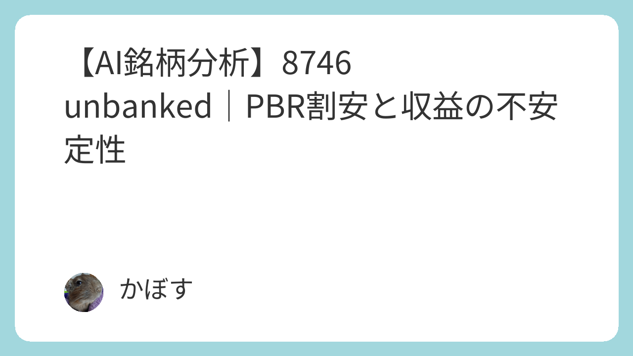 本レポートでは、unbanked株式会社(8746)について、AIが収集・分析した財務、成長性、競争優位性、リスクなどの多角的なデータに基づき評価を行います。特に、強固な財務体質と、Web3領域への事業転換によるキャピタルゲイン狙いのポテンシャルに焦点を当てて分析を進めていきます。