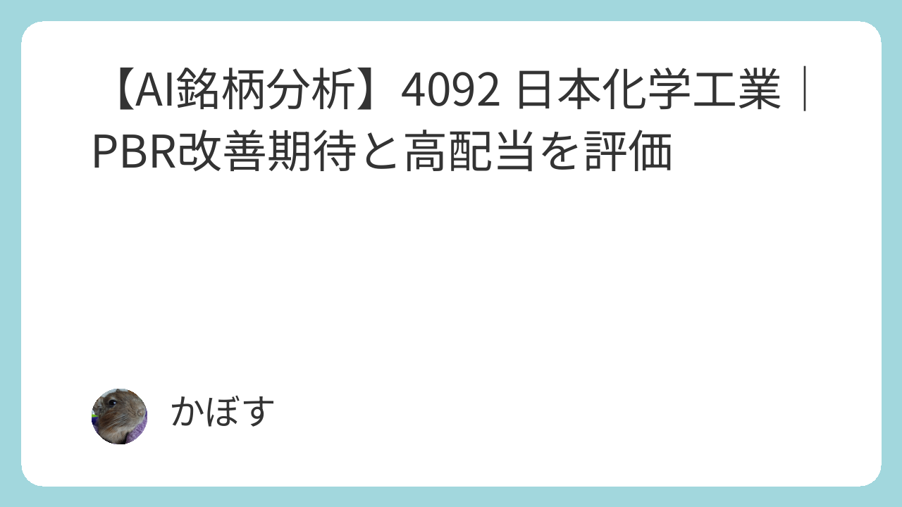 本レポートは、日本化学工業(4092)の事業内容、財務状況、成長性、そして株価水準をAIが多角的に分析した結果をまとめたものです。同社の安定した事業基盤と、PBR(株価純資産倍率)1倍割れ解消に向けた具体的な株主還元策に焦点を当て、投資対象としての妥当性を客観的に評価します。
