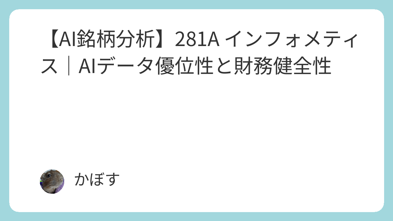 この記事では、AI技術を活用したエネルギーデータ解析を手掛ける281A インフォメティスについて、キャピタルゲイン狙いの観点から徹底的に分析したレポートを共有します。本レポートは、企業の収益性、成長性、競争優位性、そして現在の株価水準の妥当性を客観的に評価したものです。
