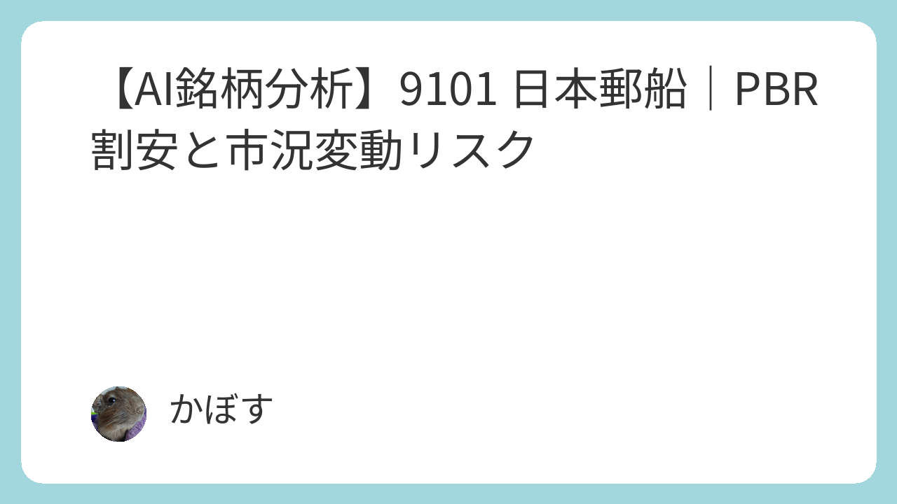本レポートは、日本郵船(9101)の企業分析をAIが実行し、その結果を構造化して提供するものです。海運市況という外部要因に大きく左右されるシクリカル銘柄(景気循環株)の特徴を持ちながら、極めて強固な財務体質とPBR割安水準をどのように評価すべきかを、キャピタルゲイン狙いとディフェンシブコアという二つの投資スタイルで検証します。