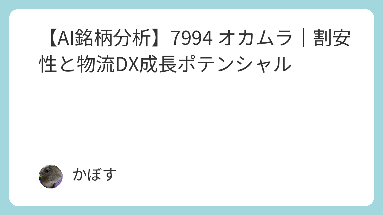 オカムラ(7994)は、極めて優秀な財務健全性、高い配当利回り、そして将来の収益性を高める物流DXという成長ドライバーを併せ持つ優良企業です。