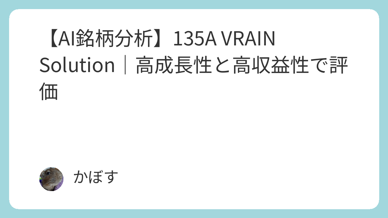 本レポートは、VRAIN Solution(135A)について、AIが企業の公式発表や信頼性の高い情報源に基づき、その事業内容、業績、財務状況、株価水準を客観的に分析したものです。