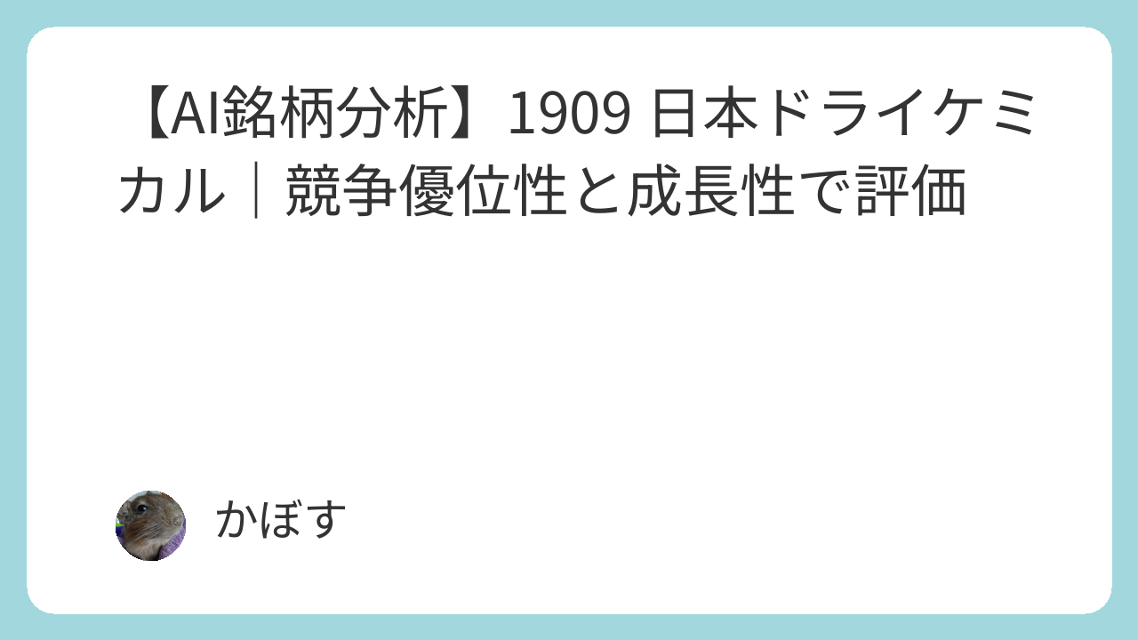 この記事では、日本ドライケミカル(1909)について、AIが分析した事業内容、近年の業績推移、財務状況、そして競争優位性などをまとめています。社会インフラを支えるディフェンシブな側面に加え、どのような成長要因があるかを客観的なデータに基づき評価します。