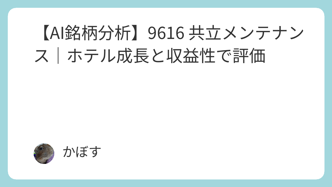 この記事では、AIによる財務・事業分析の結果に基づき、共立メンテナンス(9616)の投資魅力度を徹底的に評価します。ディフェンシブコアとしての安定性、ホテル事業の成長性、株価水準の妥当性など、多角的な視点から分析結果を構造化し、ポートフォリオ組み入れの検討に資する情報を提供します。