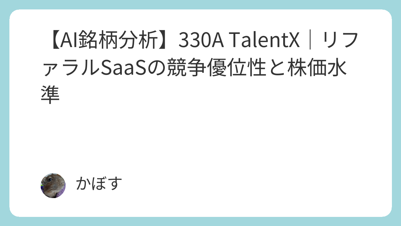 本レポートは、330A TalentX(東証グロース)について、AIによる多角的な分析結果をまとめたものです。事業の競争優位性、成長性、財務状況、株価水準などを客観的なデータに基づき評価し、投資検討の一助となる情報を提供することを目的としています。