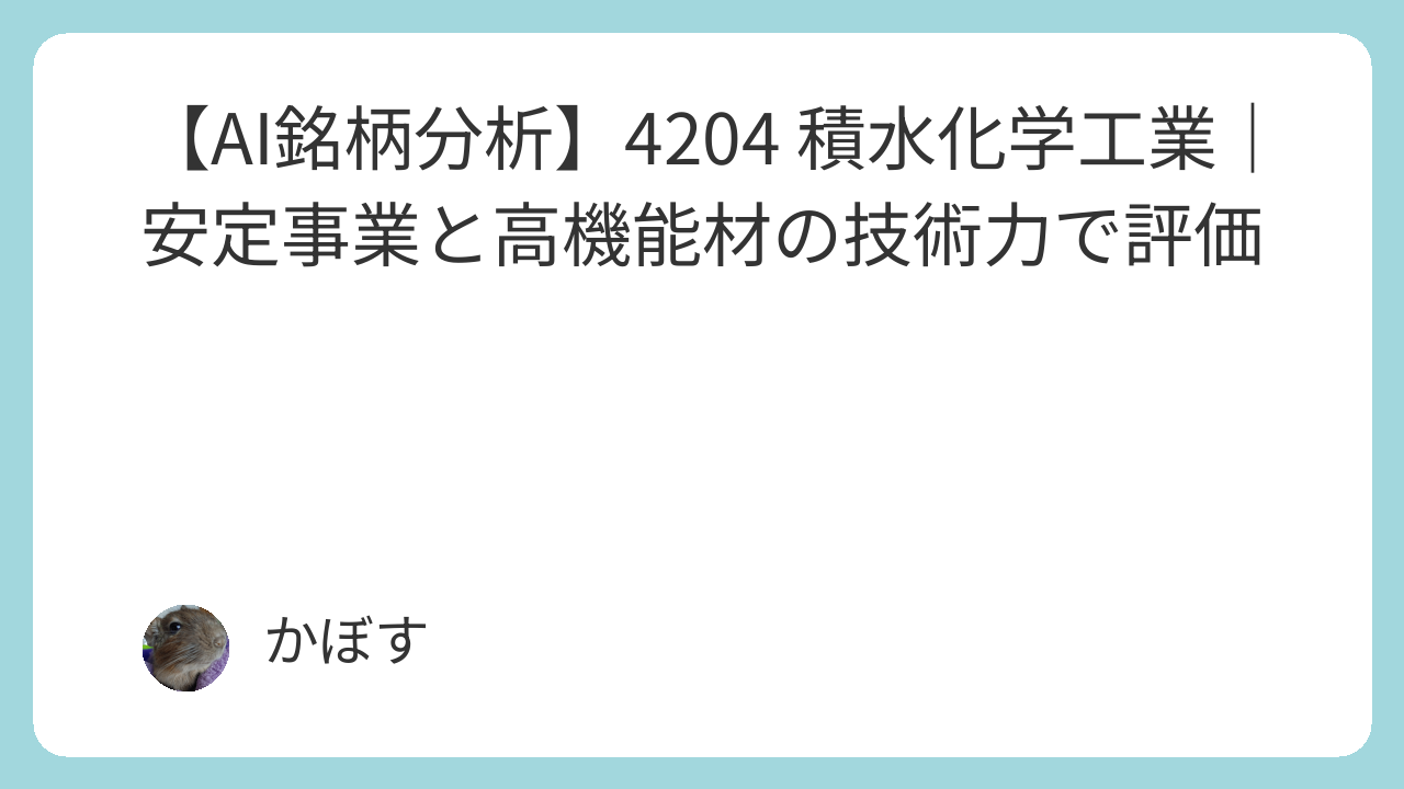 本レポートでは、積水化学工業(4204)について、財務、成長性、競争優位性、リスクといった多角的な観点からAIが分析した結果をまとめています。同社がキャピタルゲイン狙い、ディフェンシブコアといった投資スタイルにおいて、どのような魅力とリスクを抱えているのかを客観的に評価します。