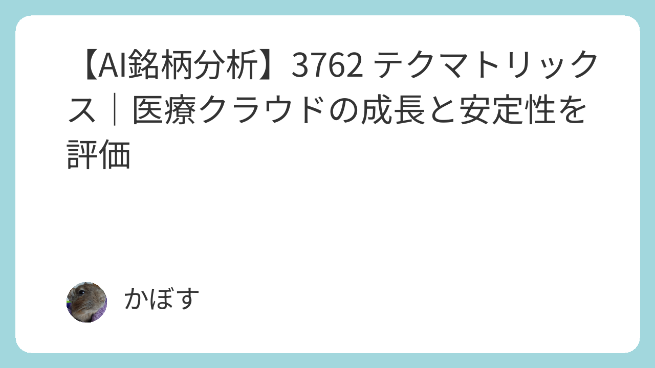 本レポートでは、医療クラウドとサイバーセキュリティという2つの成長テーマを持つテクマトリックス(3762)について、AIが多角的な視点から分析を行います。 収益構造の質、財務の安全性、そして現在の株価水準の妥当性を評価し、ポートフォリオにおける役割(キャピタルゲイン狙いか、ディフェンシブコアか)を明確にします。 安定成長を続ける同社が、投資対象としてどのような魅力とリスクを持っているのか、客観的なデータに基づいて解説します。