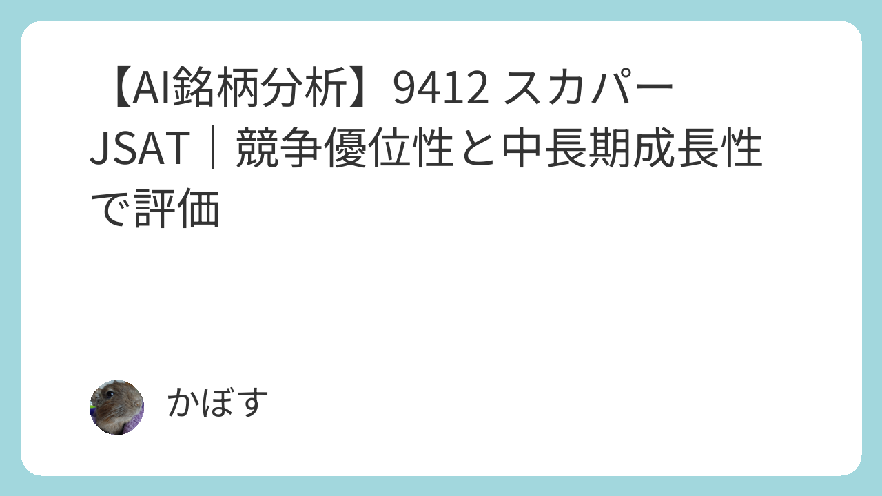 本レポートは、スカパーJSATホールディングス(9412)の企業価値を、AIが客観的なデータと成長ストーリー診断のフレームワークに基づいて分析した結果をまとめたものです。現在の事業基盤と、次世代宇宙事業への変革がもたらす中長期的な成長ポテンシャル、および潜在的なリスク要因について評価しています。