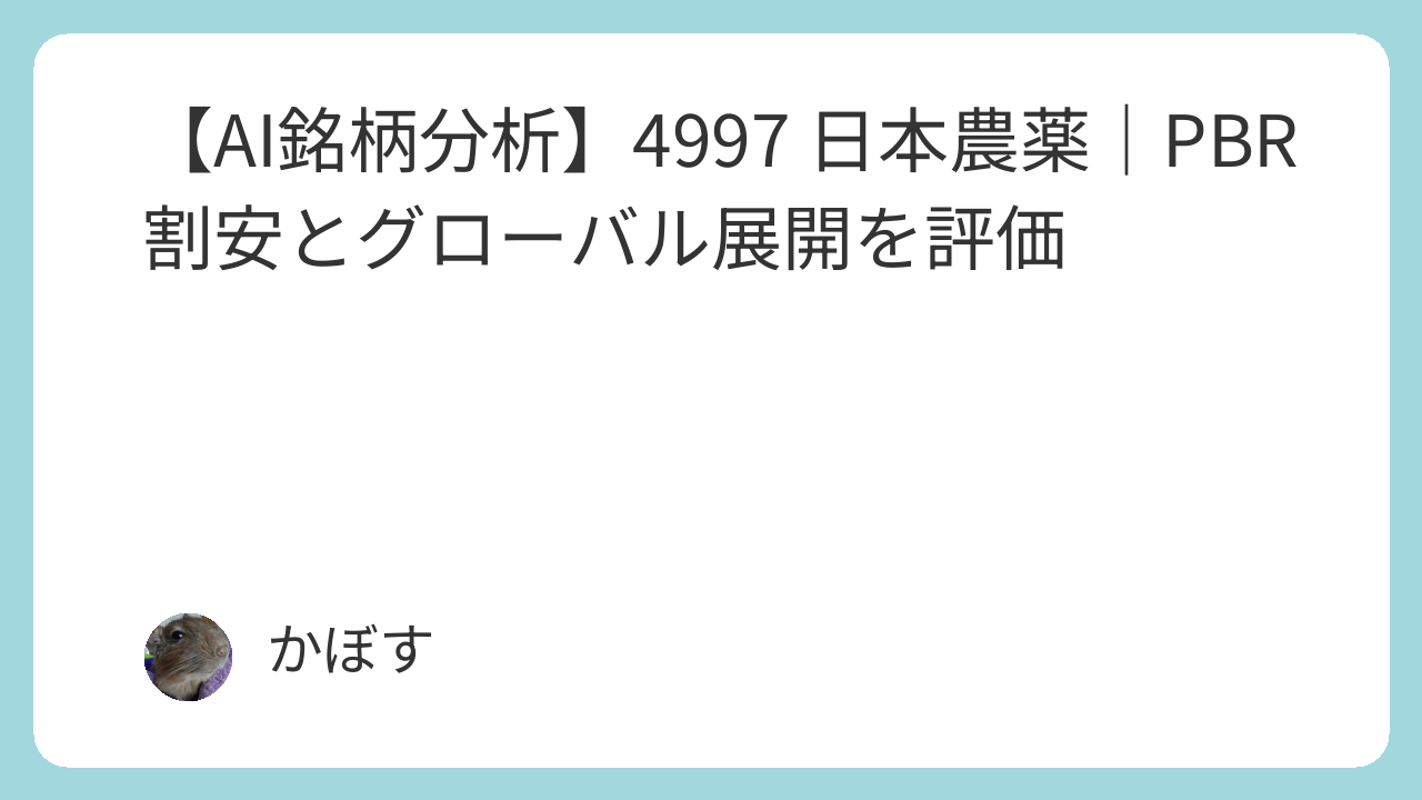 本レポートは、日本農薬(4997)の財務状況、成長戦略、株価水準などを多角的に分析し、投資判断に役立つ客観的な情報を提供することを目的としています。本分析は、特定の投資行動を断定的に推奨するものではありません。