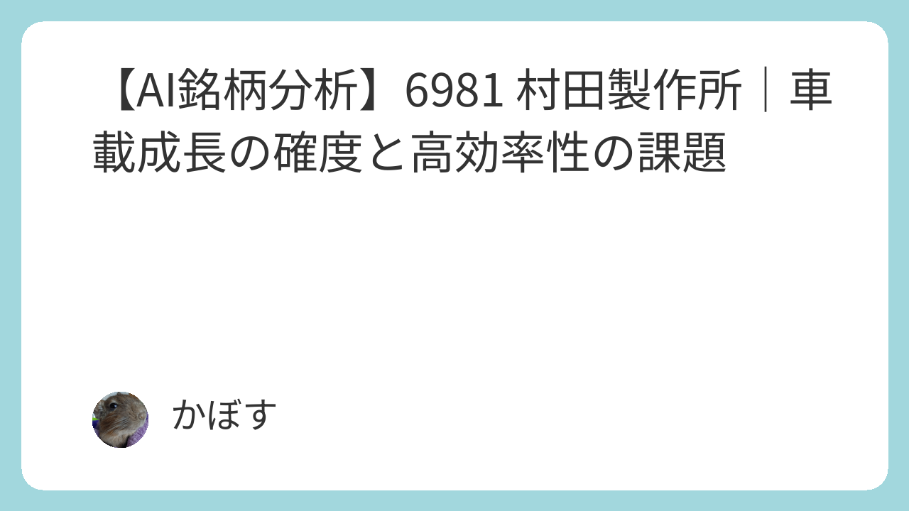 本レポートは、電子部品大手である村田製作所(6981)について、AIによる分析結果を基に、収益性、成長性、財務健全性、そして株価水準の妥当性を評価するものです。当社の技術的優位性と市場におけるポジション、中長期的な成長の可能性とリスクを客観的に解説します。