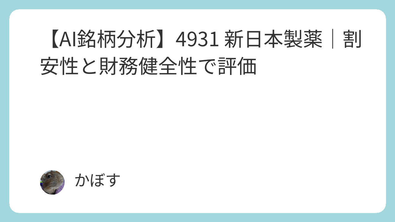 本レポートは、新日本製薬(4931)について、直近の決算情報、財務指標、事業成長性、競争優位性、そして株価の割安性をAIが分析・評価した結果をまとめたものです。