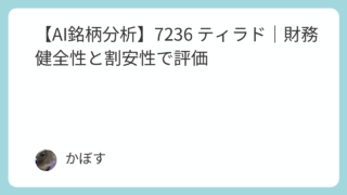 ディフェンシブコア銘柄 【AI銘柄分析】7236 ティラド|財務健全性と割安性で評価 企業紹介ティラド(7236)は、自動車、建設機械、産業機械向け熱交換器を製造・販売する独立系の大手部品メーカーです。特に二輪車用ラジエータの分野では、世界の水冷二輪車市場で過半数のシェアを占めており、強固な事業基盤を築いています。近年は、自... 2025.11.02 AI評価★★★☆☆【守】ディフェンシブコア銘柄管理人注目度★★★☆☆