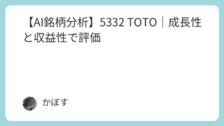 ディフェンシブコア銘柄 【AI銘柄分析】5332 TOTO|成長性と収益性で評価 企業紹介TOTOは、日本の水まわり住宅設備をリードする総合メーカーです。事業は「グローバル住設事業」と「新領域事業」の2つに大別されます。グローバル住設事業では、温水洗浄便座「ウォシュレット」を始めとするトイレ、バスルーム、キッチン関連商品... 2025.09.29 AI評価★★★★☆【守】ディフェンシブコア銘柄管理人注目度★★★★☆