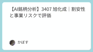 ディフェンシブコア銘柄 【AI銘柄分析】3407 旭化成|割安性と事業リスクで評価 企業紹介旭化成は、「マテリアル」「住宅」「ヘルスケア」という3つの事業セグメントを持つ総合化学メーカーです。幅広い事業を展開しており、それぞれの市場で独自の製品やサービスを提供しています。AI銘柄分析レポートはじめに本レポートでは、AIによ... 2025.09.27 AI評価★★☆☆☆【守】ディフェンシブコア銘柄管理人注目度★★☆☆☆