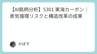 AI評価★★☆☆☆【守】 【AI銘柄分析】5301 東海カーボン|景気循環リスクと構造改革の成果 企業紹介東海カーボン(5301)は、国内でトップシェアを誇る黒鉛電極やカーボンブラックを主力とする総合炭素製品メーカーです。売上高の約79%を海外が占めており、グローバルな事業展開を行っています。鉄鋼、自動車、半導体など、多岐にわたる産業の... 2025.10.14 AI評価★★☆☆☆【守】ディフェンシブコア銘柄管理人注目度★★☆☆☆