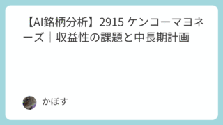 ディフェンシブコア銘柄 【AI銘柄分析】2915 ケンコーマヨネーズ|収益性の課題と中長期計画 企業紹介ケンコーマヨネーズは、マヨネーズやドレッシング、ソース、惣菜などを製造・販売している食品メーカーです。外食産業やコンビニエンスストア、スーパー、給食など、幅広い顧客に業務用食品を提供していることが特徴です。日本で初めて日持ちする「ロ... 2025.10.08 AI評価★★☆☆☆【守】ディフェンシブコア銘柄管理人注目度★★☆☆☆