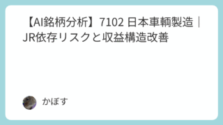 AI評価★★★★★【守】 【AI銘柄分析】7102 日本車輌製造|JR依存リスクと収益構造改善 企業紹介日本車輌製造(7102)は、JR東海を親会社に持つ大手鉄道車両メーカーです。主要な事業として、鉄道車両の製造・販売を核に、建設機械、輸送用機器・鉄構、エンジニアリングの4つの分野を展開しています。特に、親会社であるJR東海向けの新幹... 2025.10.26 AI評価★★★★★【守】ディフェンシブコア銘柄管理人注目度★★★★☆