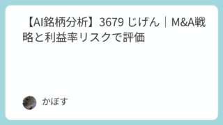 キャピタルゲイン狙い銘柄 【AI銘柄分析】3679 じげん|M&A戦略と利益率リスクで評価 企業紹介3679 じげんは、「生活機会(より良く生きる選択肢)の最大化」を企業理念に掲げている企業です。主に求人、住まい、車など、複数のライフイベント領域に特化した情報集約型プラットフォーム(バーティカルメディア)を運営しています。M&A(... 2025.10.11 AI評価★★★☆☆【攻】キャピタルゲイン狙い銘柄管理人注目度★★☆☆☆