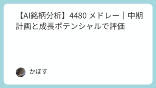 キャピタルゲイン狙い銘柄 【AI銘柄分析】4480 メドレー|中期計画と成長ポテンシャルで評価 企業紹介メドレー(4480)は、「医療ヘルスケアの未来をつくる」をミッションに、医療ヘルスケア分野に特化したインターネットサービスを提供しています。主な事業は、医療・介護の人材採用を支援する**「人材プラットフォーム事業」と、オンライン診療... 2025.09.26 AI評価★★★★★【攻】キャピタルゲイン狙い銘柄管理人注目度★★☆☆☆