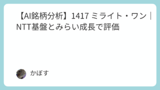 AI評価★★★★☆【守】 【AI銘柄分析】1417 ミライト・ワン|NTT基盤とみらい成長で評価 企業紹介株式会社ミライト・ワン(証券コード: 1417)は、NTTグループ向けの通信インフラ建設・保守を主軸とする、国内トップクラスの総合エンジニアリング企業です。同社は従来の通信事業を核としつつ、近年はM&A(西武建設、国際航業など)を積... 2025.10.23 AI評価★★★★☆【守】ディフェンシブコア銘柄管理人注目度★★★★☆