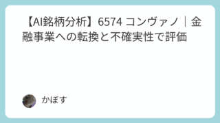 キャピタルゲイン狙い銘柄 【AI銘柄分析】6574 コンヴァノ|金融事業への転換と不確実性で評価 企業紹介コンヴァノ(6574)は、かつてネイルサロン事業を主軸としていましたが、現在はその収益性の低い事業から脱却し、インベストメント&アドバイザリー(I&A)事業を新たな収益の柱としています。同社は、AIデータセンター事業やグリーン・ビッ... 2025.10.28 AI評価★★★★☆【攻】キャピタルゲイン狙い銘柄管理人注目度★★☆☆☆