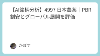 ディフェンシブコア銘柄 【AI銘柄分析】4997 日本農薬|PBR割安とグローバル展開を評価 企業紹介日本農薬(証券コード:4997)は、「食とくらしのグローバルイノベーター」をビジョンに掲げる、日本で初めて設立された農薬専業メーカーです。農薬事業を中核とし、海外売上高比率は70%を超えるグローバル展開を進めています。農薬研究で培っ... 2025.12.19 AI評価★★★★☆【守】ディフェンシブコア銘柄管理人注目度★★★☆☆