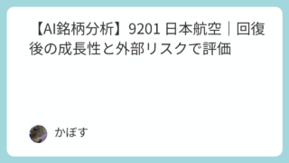 ディフェンシブコア銘柄 【AI銘柄分析】9201 日本航空|回復後の成長性と外部リスクで評価 企業紹介日本航空(JAL)は、国内線および国際線における航空運送事業(フルサービスキャリア/LCC)を主軸としています。これに加えて、貨物郵便事業、空港旅客サービス、航空機整備などの関連事業を展開しています。近年では、マイル・ライフ・インフ... 2025.11.10 AI評価★★★☆☆【守】ディフェンシブコア銘柄管理人注目度★★☆☆☆
