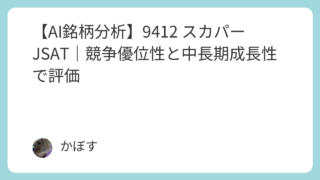 ディフェンシブコア銘柄 【AI銘柄分析】9412 スカパーJSAT|競争優位性と中長期成長性で評価 企業紹介スカパーJSATホールディングス(9412)は、メディア事業と宇宙・衛星事業を二つの柱として展開する企業グループです。メディア事業では、「スカパー!」を通じた多チャンネル放送サービスを提供しています。一方、宇宙事業では、アジア最大級... 2025.12.13 AI評価★★★☆☆【守】AI評価★★★☆☆【攻】キャピタルゲイン狙い銘柄ディフェンシブコア銘柄管理人注目度★★★☆☆