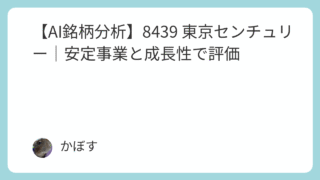 ディフェンシブコア銘柄 【AI銘柄分析】8439 東京センチュリー|安定事業と成長性で評価 企業紹介東京センチュリーは、伊藤忠商事を筆頭株主とする日本の大手総合リース会社です。単なるリース業務に留まらず、オートモビリティ、航空機・不動産等のスペシャルティ、国際、そして環境インフラといった多岐にわたる事業をグローバルに展開しています... 2025.10.04 AI評価★★★★★【守】ディフェンシブコア銘柄管理人注目度★★★★☆