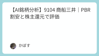 ディフェンシブコア銘柄 【AI銘柄分析】9104 商船三井|PBR割安と株主還元で評価 企業紹介商船三井(9104)は、日本を代表する大手総合海運会社の一つです。主にコンテナ船、ドライバルク船、タンカー、LNG船といった海運事業を主軸とし、これに加えて不動産、フェリー、クルーズ船などの非海運事業(ウェルビーイングライフ事業)も... 2025.10.26 AI評価★★★☆☆【守】ディフェンシブコア銘柄管理人注目度★★☆☆☆