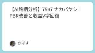 ディフェンシブコア銘柄 【AI銘柄分析】7987 ナカバヤシ|PBR改善と収益V字回復 企業紹介ナカバヤシ株式会社(7987)は、アルバムや図書製本を祖業とする老舗の大手企業です。長年にわたり「フエルアルバム」や「スイング・ロジカルノート」といった文具・事務用品で強固な市場地位を築いてきました。近年は、紙製品事業に加え、企業の... 2025.10.30 AI評価★★★★☆【守】AI評価★★☆☆☆【攻】ディフェンシブコア銘柄管理人注目度★★★☆☆