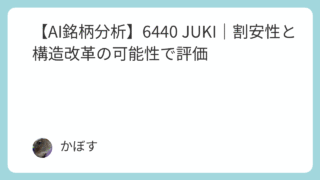 キャピタルゲイン狙い銘柄 【AI銘柄分析】6440 JUKI|割安性と構造改革の可能性で評価 企業紹介JUKI (6440) は、工業用ミシン(縫製機器事業)で世界大手の地位を確立している日本の製造業の企業です。アパレル産業向けだけでなく、電子部品実装機(マウンタ)などを扱う産業機器事業も展開しています。近年は業績低迷からの脱却を目... 2025.11.19 AI評価★★★☆☆【攻】キャピタルゲイン狙い銘柄管理人注目度★★☆☆☆