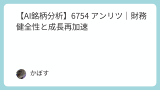 ディフェンシブコア銘柄 【AI銘柄分析】6754 アンリツ|財務健全性と成長再加速 企業紹介アンリツ(6754)は、通信計測器を主力とする日本の電子計測機器メーカーです。特に、5G/6Gといった次世代通信技術向けの「テストソリューション」に強みを持っており、海外売上比率が高いグローバル企業です。また、食品・医薬品向けの品質... 2025.11.22 AI評価★★★☆☆【守】ディフェンシブコア銘柄管理人注目度★★★☆☆