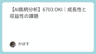 ディフェンシブコア銘柄 【AI銘柄分析】6703 OKI|成長性と収益性の課題 企業紹介沖電気工業(6703 OKI)は、情報通信システム、ATM、プリンター、EMSを主軸とする総合電機メーカーです。同社の主要な収益源は、社会インフラや防衛関連を担うパブリックソリューション事業と、ATM・金融システム関連のエンタープラ... 2025.11.30 AI評価★★★☆☆【守】ディフェンシブコア銘柄管理人注目度★★★☆☆