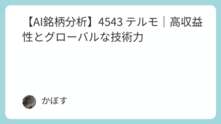 AI評価★★★★★【守】 【AI銘柄分析】4543 テルモ|高収益性とグローバルな技術力 企業紹介テルモは、心臓血管カンパニー、メディカルケアソリューションズカンパニー、血液・細胞テクノロジーカンパニーの3事業を柱とするグローバルな医療機器メーカーです。特に、カテーテル治療デバイスなどの心臓血管分野が収益の根幹を成しています。売... 2025.10.23 AI評価★★★★★【守】ディフェンシブコア銘柄管理人注目度★★★★☆