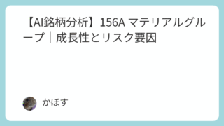 キャピタルゲイン狙い銘柄 【AI銘柄分析】156A マテリアルグループ|成長性とリスク要因 企業紹介マテリアルグループ(156A)は、**「PR発想/ストーリーテリング」**をコアとしたマーケティングコミュニケーションの総合支援を行う専門事業集団です。企業の広報・PR活動に留まらず、マーケティング課題の解決までをワンストップで支援... 2025.10.09 AI評価★★★★☆【攻】キャピタルゲイン狙い銘柄管理人注目度★★★★★