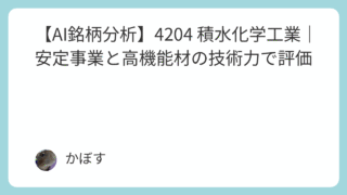 ディフェンシブコア銘柄 【AI銘柄分析】4204 積水化学工業|安定事業と高機能材の技術力で評価 企業紹介積水化学工業は、住宅、環境・ライフライン、高機能プラスチックスの3つのセグメントを柱とする大手総合化学メーカーです。特に、自動車の合わせガラス用中間膜で世界シェア約40%を占めるなど、特定の分野で高い技術力と市場支配力を有している点... 2025.11.30 AI評価★★★★☆【守】ディフェンシブコア銘柄管理人注目度★★★★☆